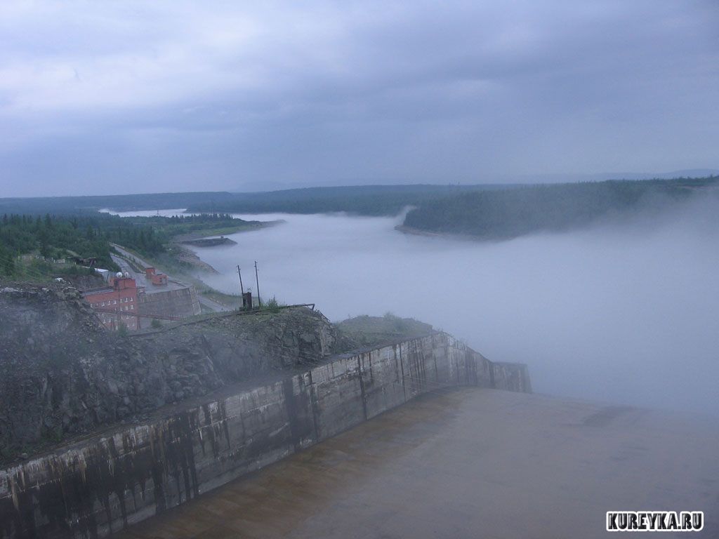 Описание: Туман над Курейкой и водосбросом Курейской ГЭС
